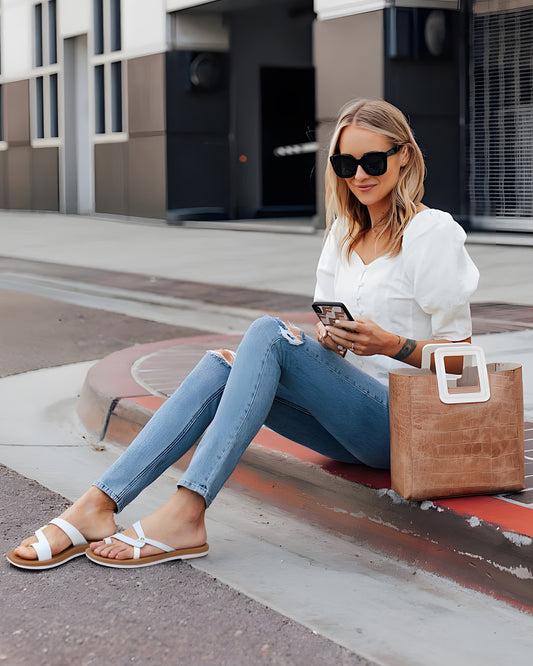 ONCAI Flat Sandals for Women Trendy Square Open Split-Toe Ring Summer Dressy Cross Strappy Slides Sandles with Slip-on Rubber Soles